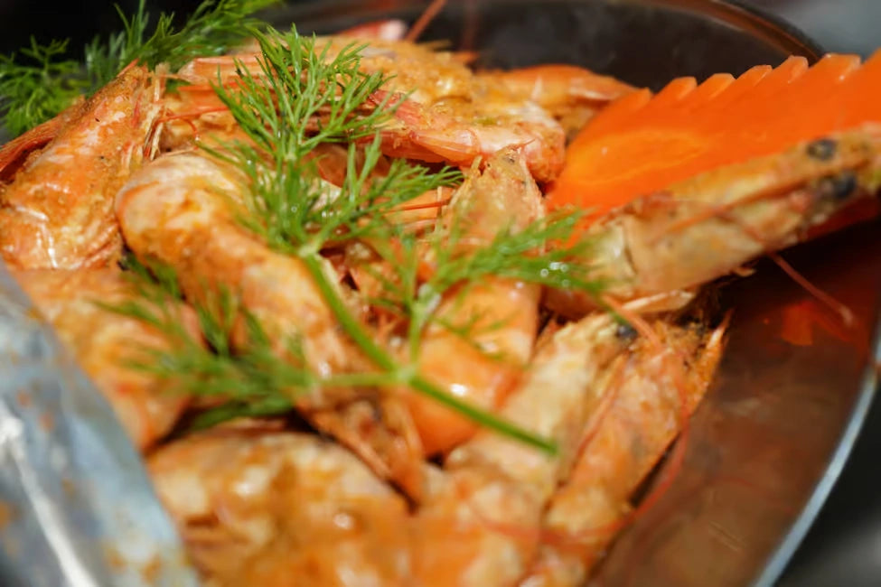 ✔ Mittagsbuffet mit Meeresfrüchten (Gemüsesuppe, Garnelen, Fisch)