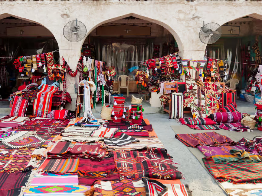 Souq WaqifUn paseo por los animados callejones del Souq Waqif ofrece una auténtica visión del rico patrimonio de Catar, combinando comercio tradicional, arquitectura y cultura. Este bullicioso mercado es un tesoro de delicias de Oriente Medio, con pequeñas tiendas que exhiben una variedad de productos, desde fragantes especias y delicias de temporada hasta exquisitos perfumes, joyas, ropa y recuerdos artesanales. Más allá de las compras, el Souq Waqif cobra vida con los sonidos de la música tradicional, vibrantes exhibiciones de arte y cautivadoras actuaciones culturales, creando una atmósfera inolvidable. Tómate un descanso de explorar y relájate en uno de sus diversos restaurantes o acogedores cafés, donde puedes saborear los sabores de la cocina local e internacional mientras disfrutas de la energía única del souq.30 minutos