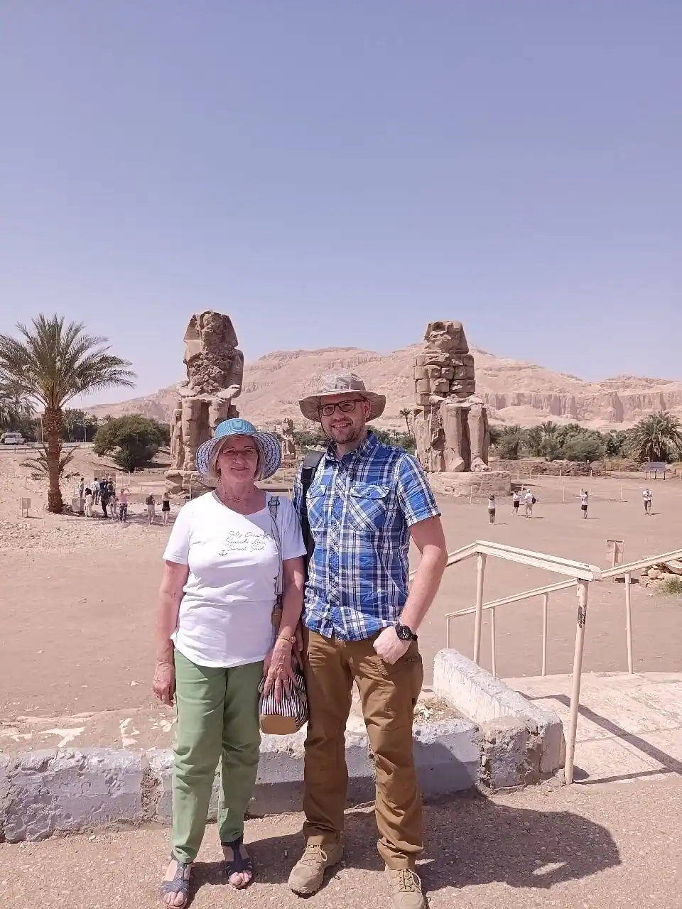 Detente en los colosos de Memnón, dos enormes estatuas de piedra del faraón Amenhotep III. Captura fotos de estos icónicos guardianes de la necrópolis tebana.