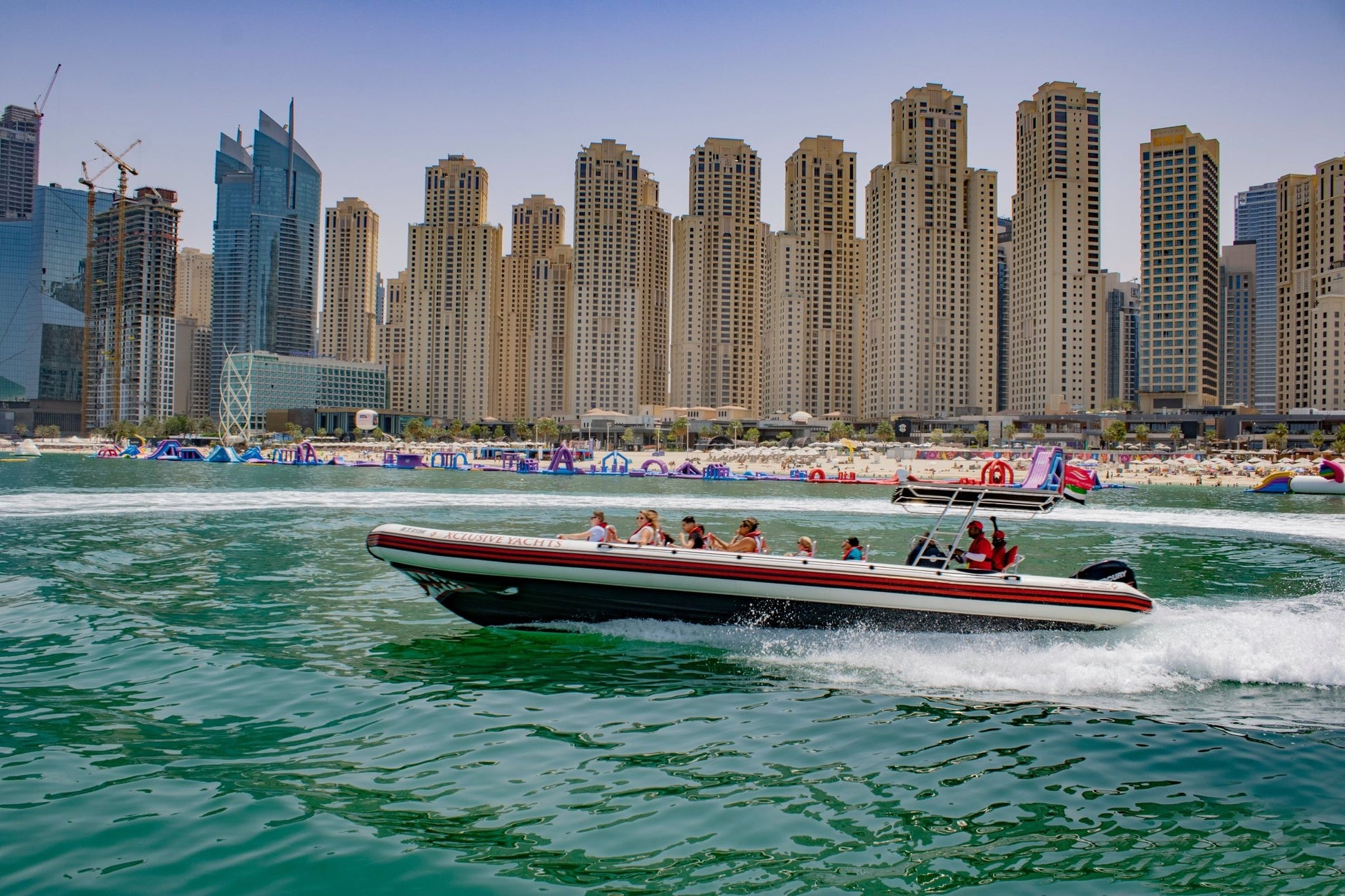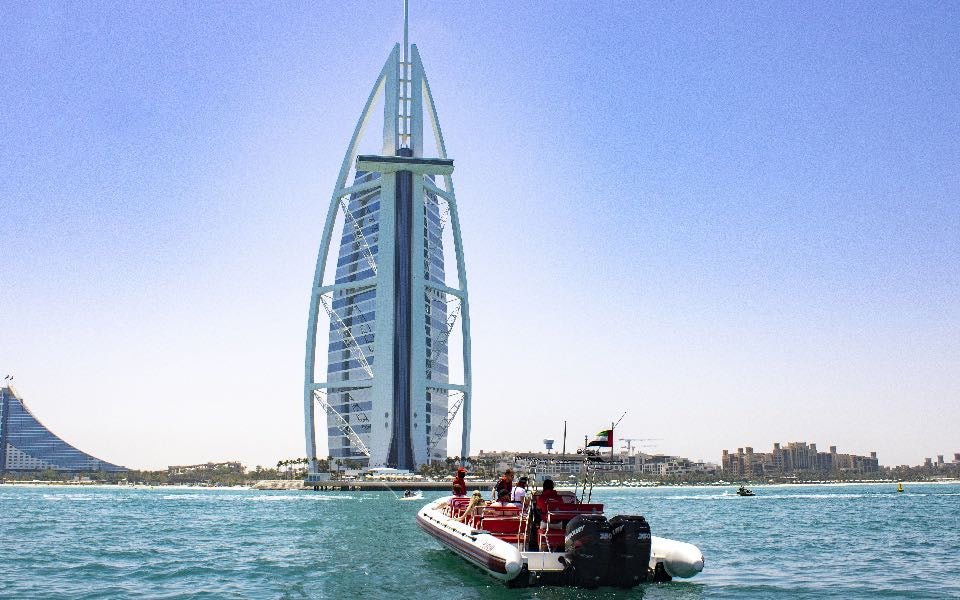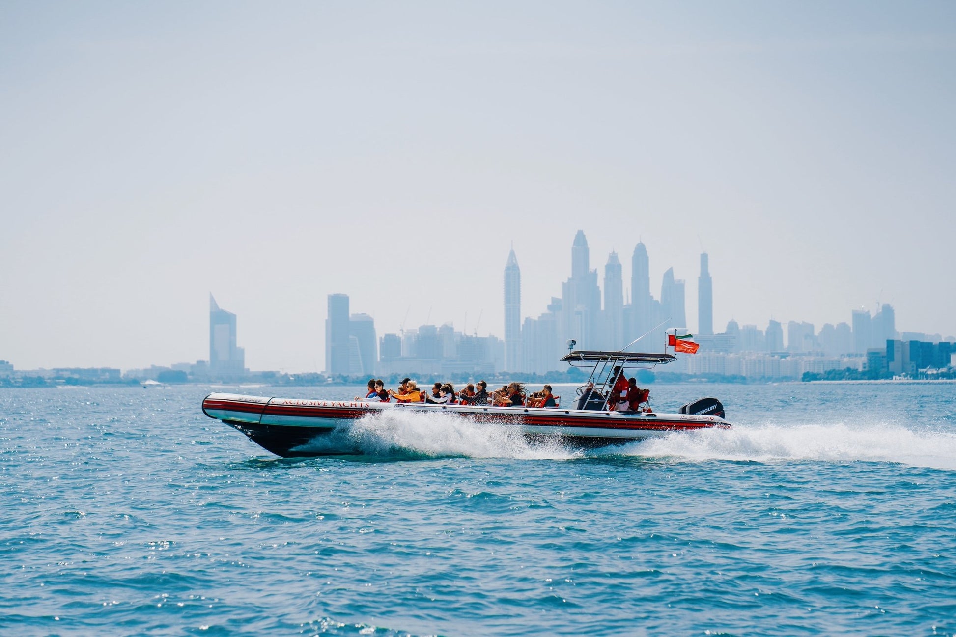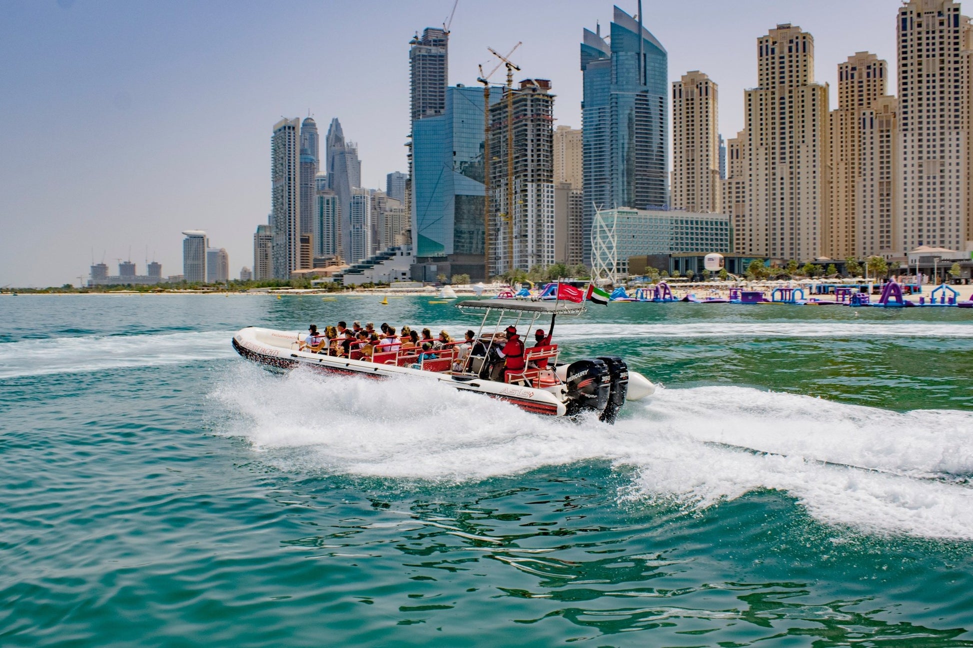 Découvrez Dubaï depuis l'eau lors d'une excursion en hors-bord pleine d'adrénaline. Découvrez les principaux sites de Dubaï d'une manière unique et amusante en traversant les eaux de la marina à la plage. Ce voyage aller-retour palpitant part de la célèbre Marina de Dubaï. L'hôte dispose d'un bureau sur la Marina où un tapis rouge vous attend pour vous accueillir. Une fois que vous vous êtes enregistré, votre guide vous fera un briefing de sécurité, alors veuillez arriver à l'heure. Embarquez pour une visite complète des sites qui vous fera naviguer à travers la marina jusqu'à Jumeirah Beach. From là, cette visite inoubliable est pleine de superbes vues et de faits amusants sur tous les hôtels de la côte, les plages, et bien sûr les principaux sites de Dubaï, y compris :