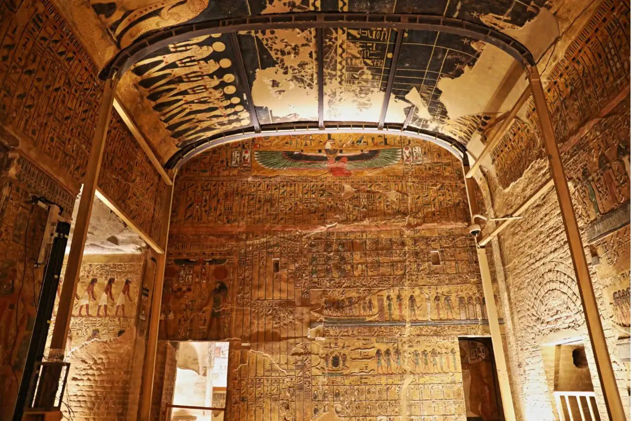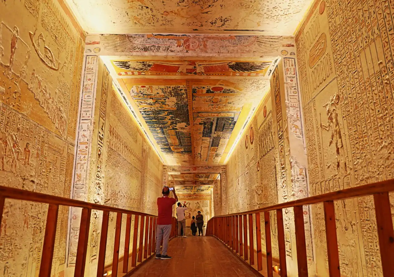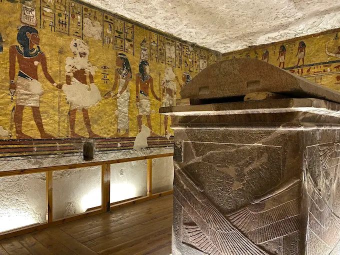 Grobowiec Tutanchamona (KV62)Grób Tutanchamona wymaga osobnego biletu i nie jest wliczony w standardowe wejście do Doliny Królów. KV62 jest jednym z najmniejszych grobowców w dolinie, ale ma duże znaczenie historyczne. Wewnątrz odwiedzający mogą wejść do opadającego korytarza i zobaczyć ozdobioną komorę grobową, która zawiera złożony sarkofag króla. Niektóre oryginalne malowidła ścienne są nadal widoczne, a mumia Tutanchamona jest wystawiona w klimatyzowanej gablocie wewnątrz komory. Ze względu na jego rozmiar, wizyty są krótkie, a pojemność ograniczona, dlatego warto przybyć wcześniej.