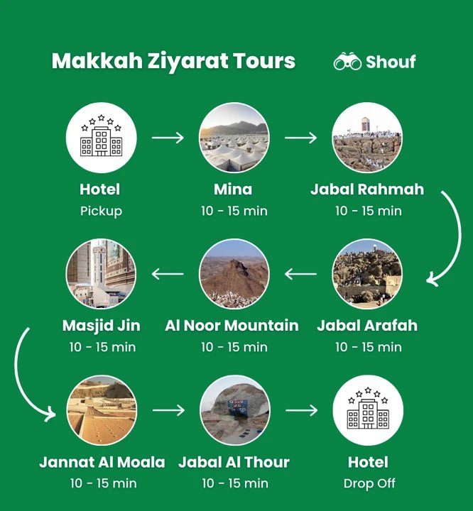 Enjoy 3-hour tours from your hotel in Makkah or Madinah to visit the nearby holy sites. You will be picked up and dropped off from your hotel in a private air conditioned vehicle of your choice (Sedan, Van, GMC or Bus). Your private driver and chauffeur will be your guide for the day. You will stop for 10-15 minutes at each of the sites. Below are the itineraries: