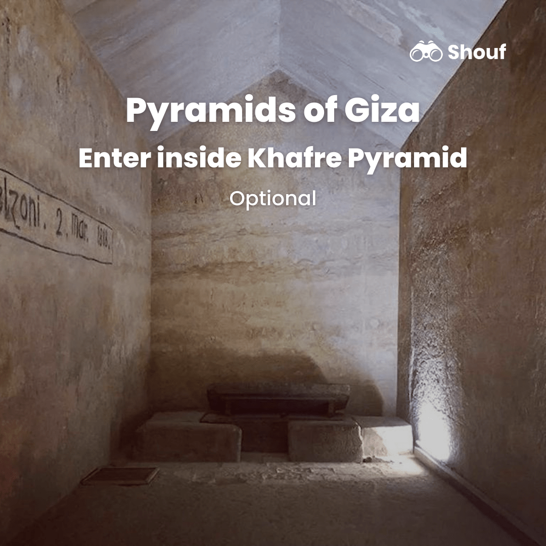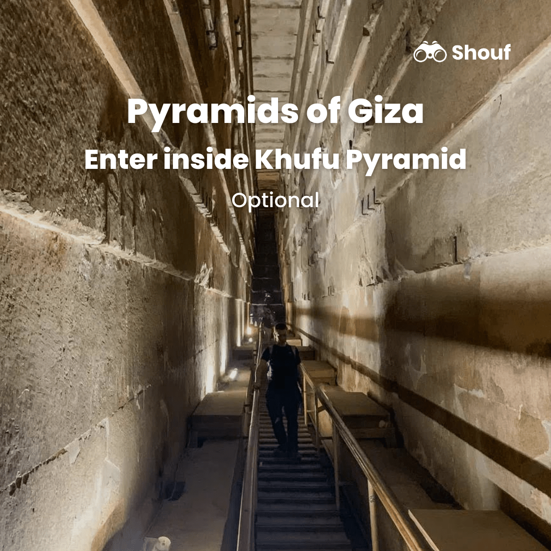 - Additional Tickets: Extra tickets are required to enter inside each pyramid. Those are Khufu (Cheops) Great Pyramid, Khafre Pyramid and Mankaure Pyramid.