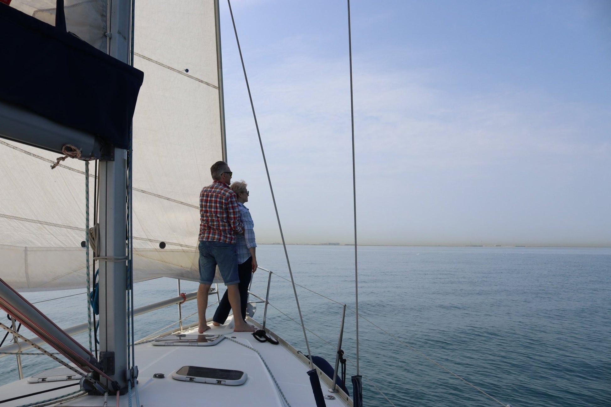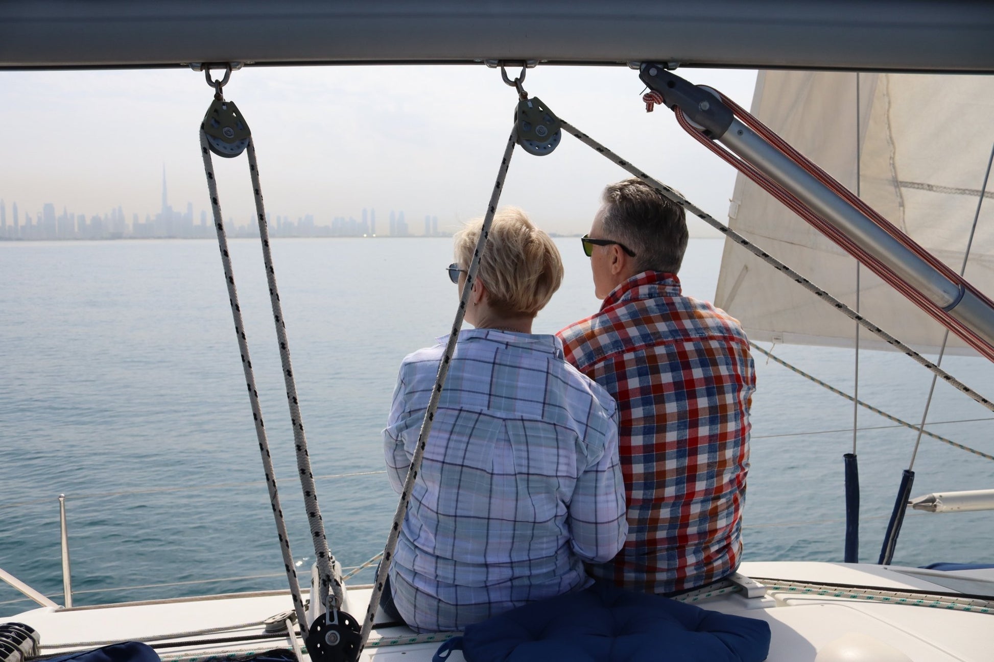 Experimente uma aventura de navegação única a bordo do nosso clássico iate à vela, o Beneteau Oceanis Clipper, que oferece vistas deslumbrantes do icônico Burj Khalifa e do horizonte da cidade. Saindo da Marina Mina Rashid, você pode se aventurar rapidamente em mar aberto. Navegue em direção às renomadas "Ilhas do Mundo" e faça uma parada para natação e outras atividades aquáticas ao longo do caminho.