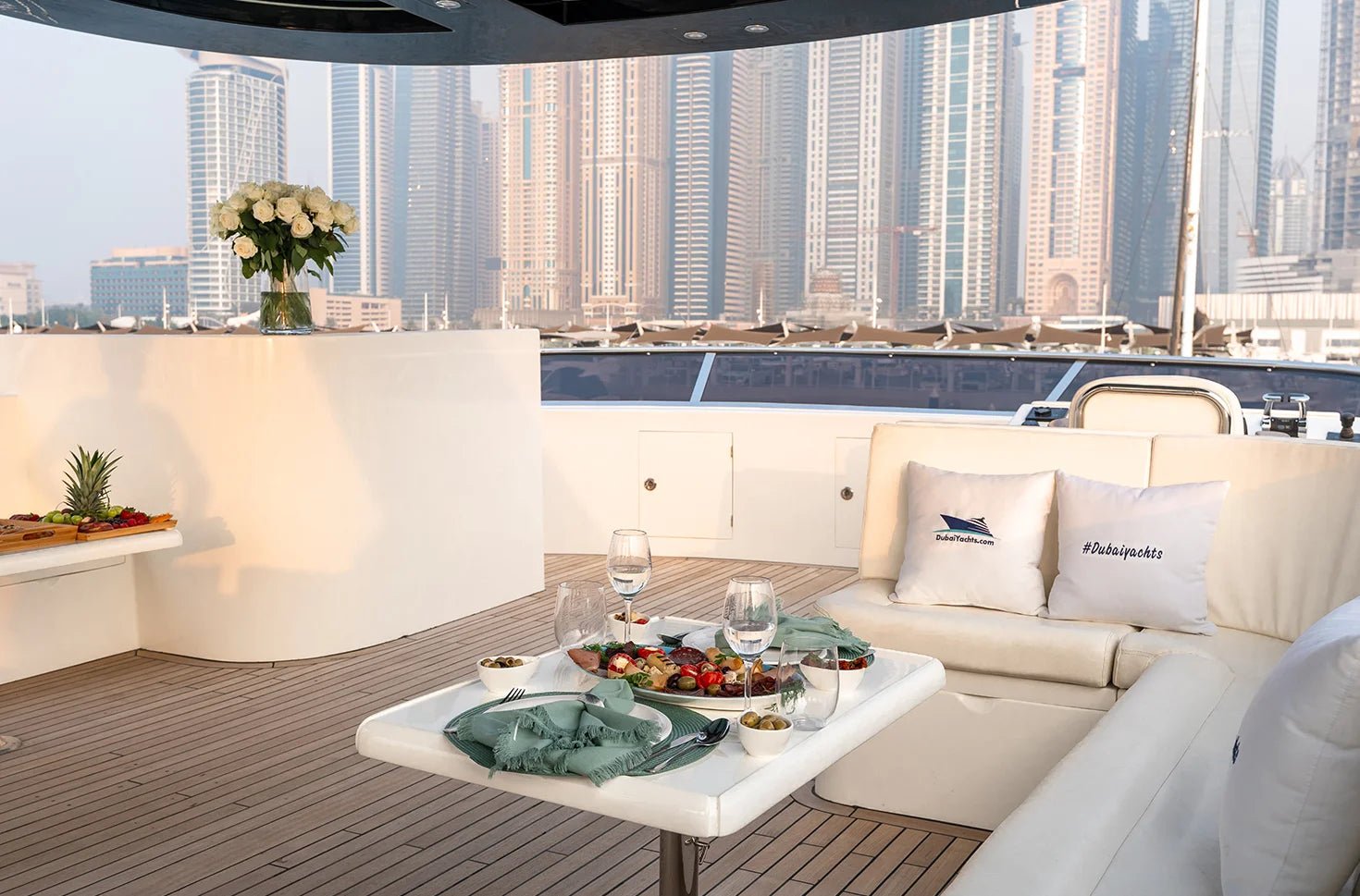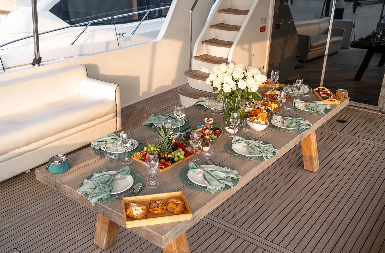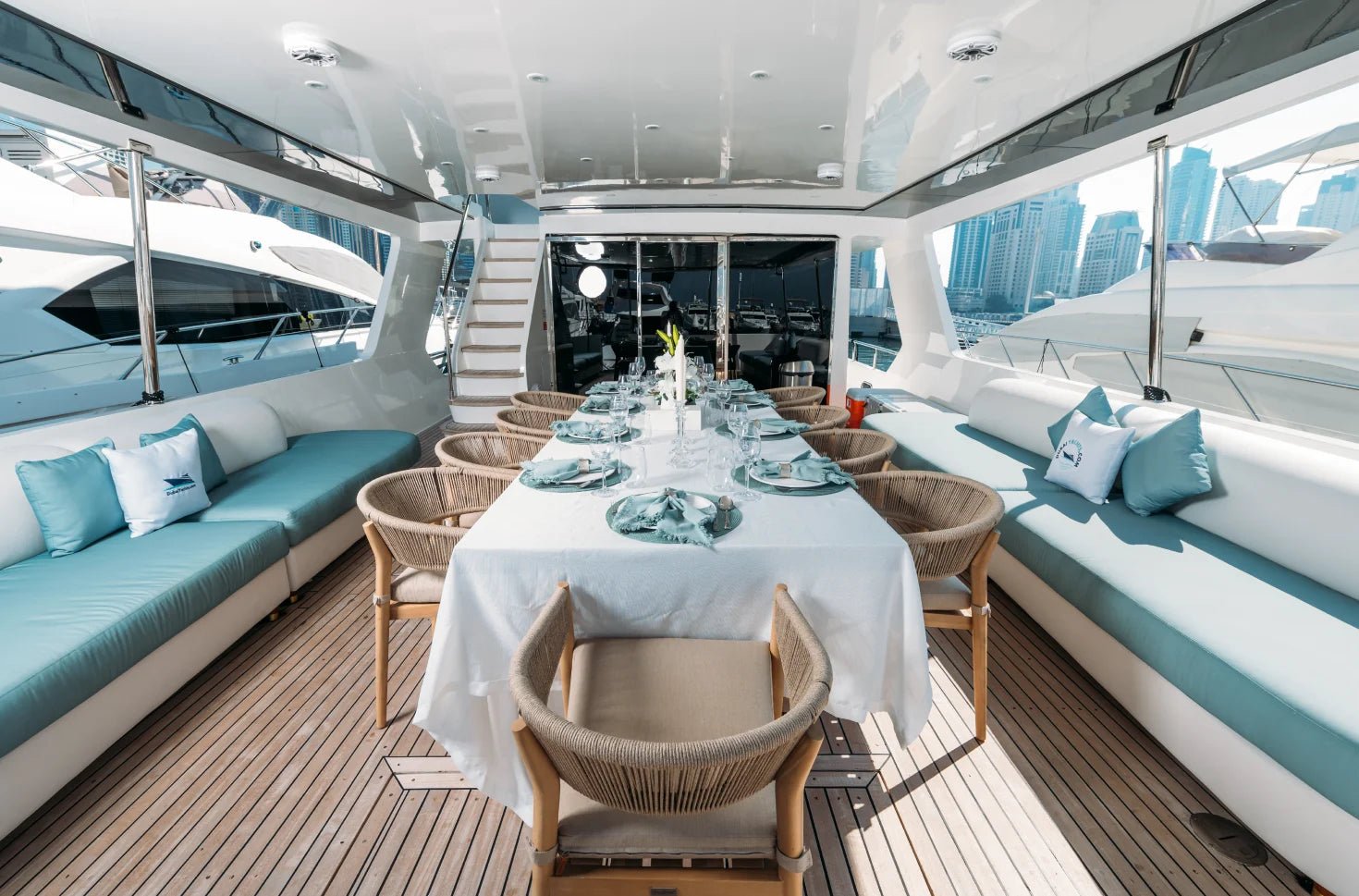 - Внешний вид: терраса, скай-лаундж, флайбридж и обеденный стол.