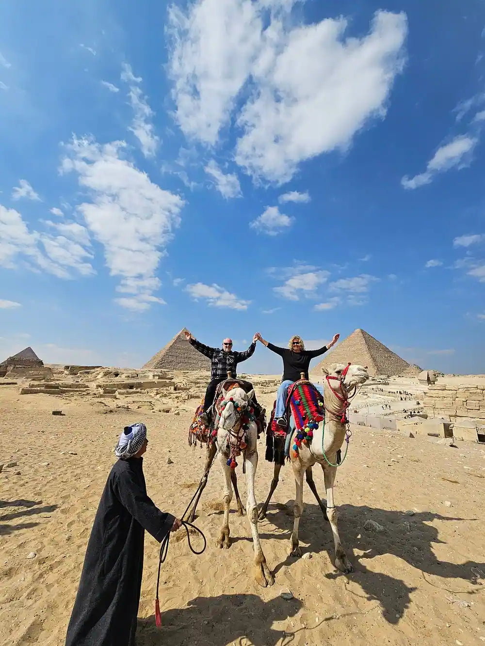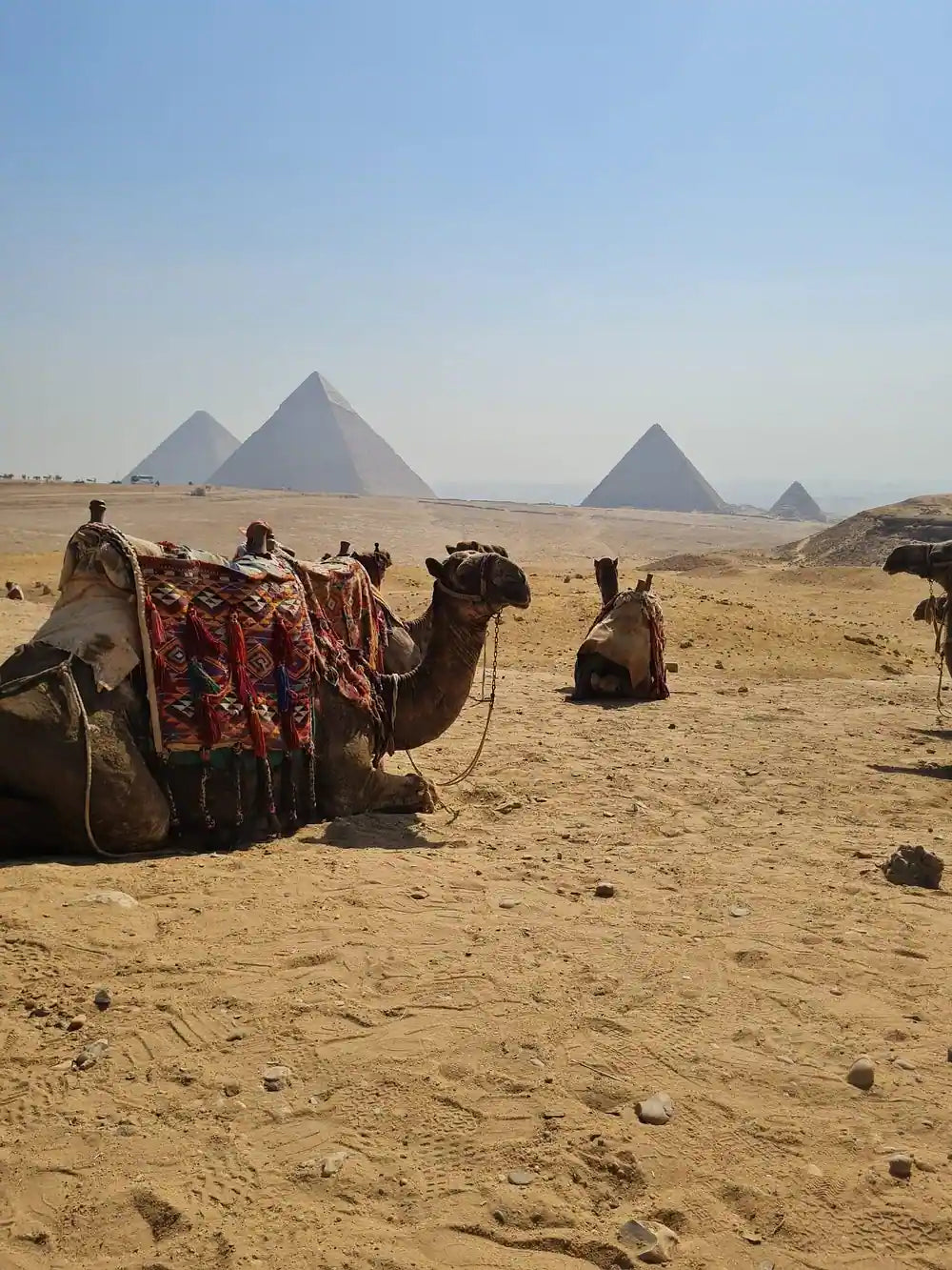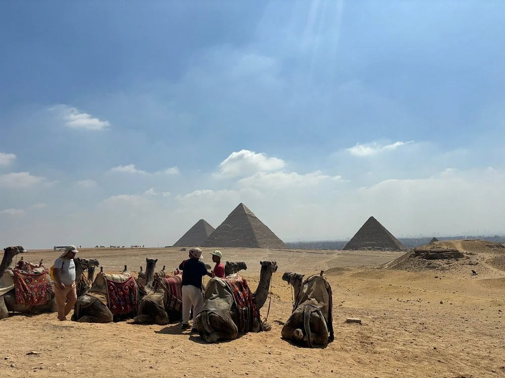 Переместитесь в панорамную зону, чтобы насладиться захватывающими видами на все три пирамиды. Путешественники могут выбрать короткую прогулку на верблюде здесь (доступно за дополнительную плату на месте).