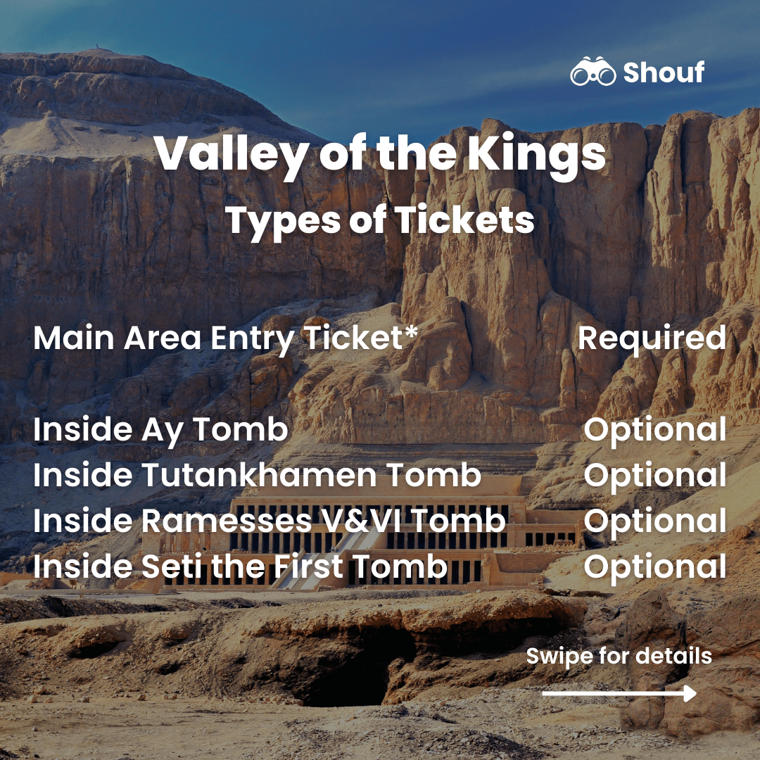 目前,在 63 座陵墓中,帝王谷有 11 座陵墓向公众开放。您的标准门票中包含其中八个,您可以从以下选项中选择三个;